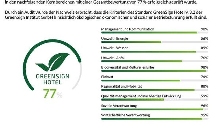 Diese Auszeichnung ist nicht nur ein Gütesiegel für nachhaltiges und umweltbewusstes Wirtschaften, sondern auch ein Beweis für unser Engagement, einen positiven Beitrag zu Umwelt und Gesellschaft zu leisten. Die GreenSign-Zertifizierung bewertet verschiedenste Bereiche nachhaltiger Unternehmensführung, und wir sind stolz darauf, in zahlreichen wichtigen Kategorien hervorragend abgeschnitten zu haben. Insgesamt haben wir sehr gute 77 % erreicht.